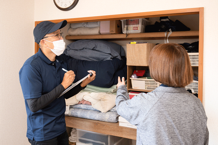 お片付けをする現地まで訪問させていただきご確認とお見積り、今後のご予定などの相談をさせていただきます。